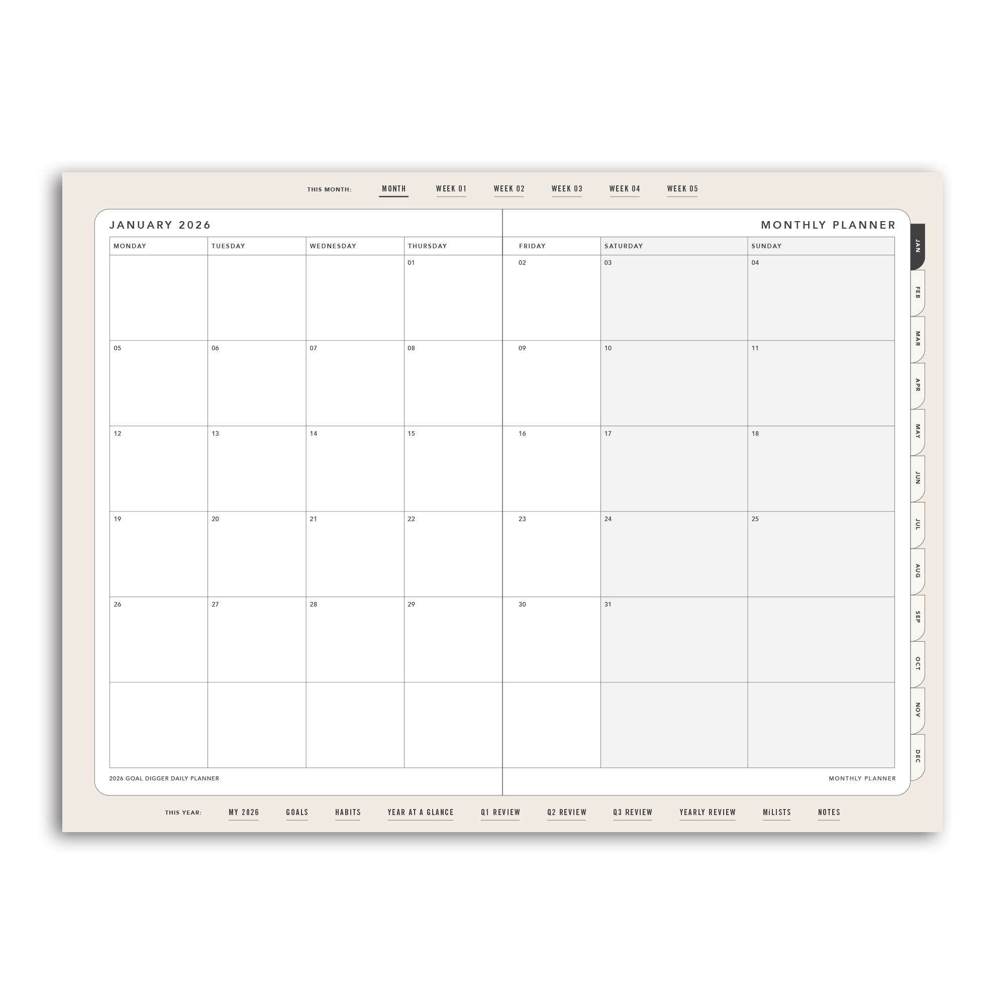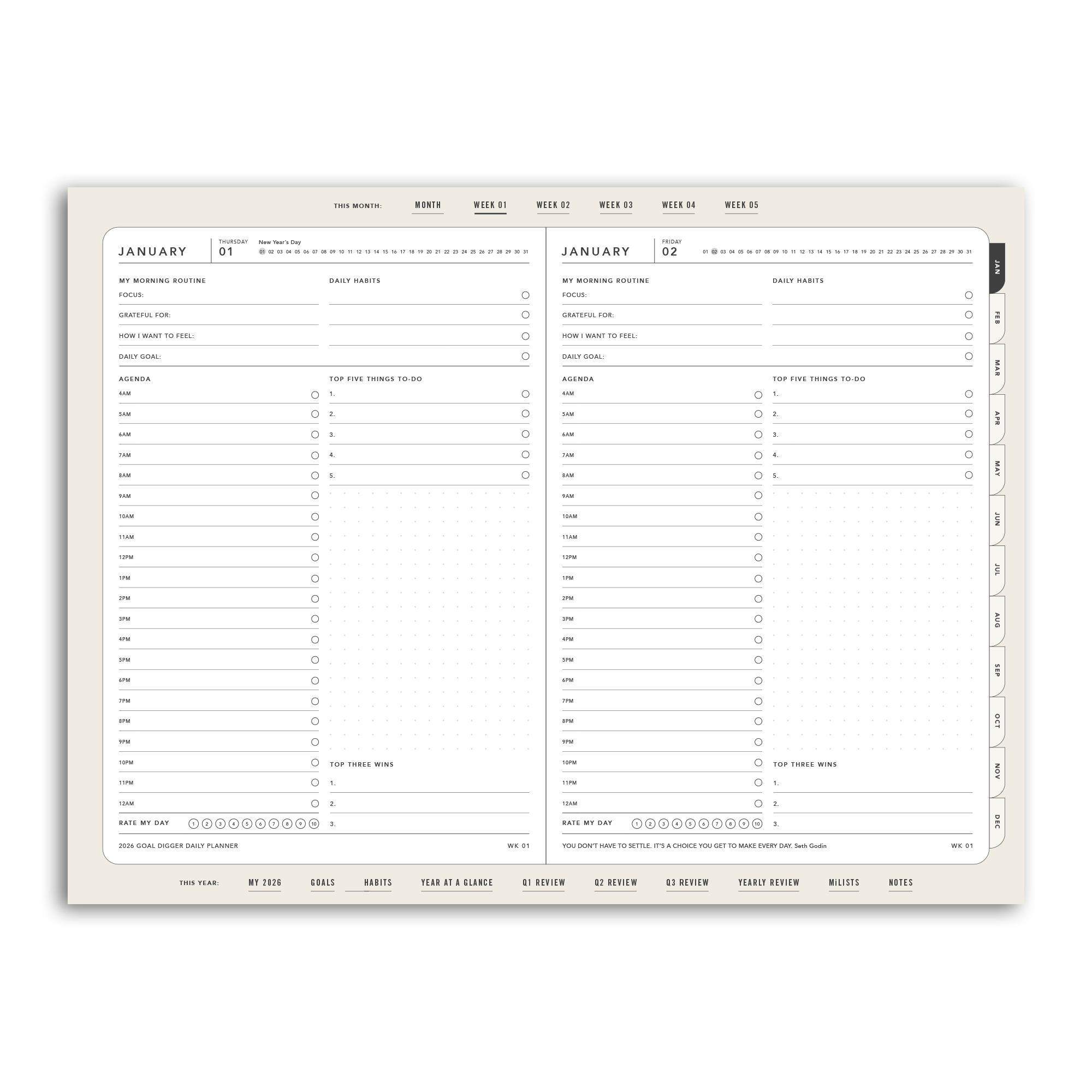 Our 2026 DAILY Goal Digger Digital (PDF) Planner is designed with a clean, minimal aesthetic, and gives you the structure and focus to actually follow through.